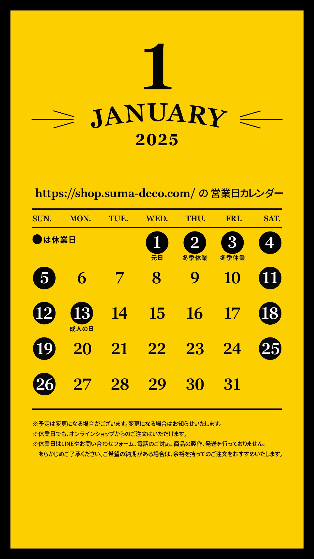 冬季休業前後のご注文に関しましては、「2024年~2025年 年末年始の営業のご案内」でご案内しておりますので、ご参照お願いいたします。